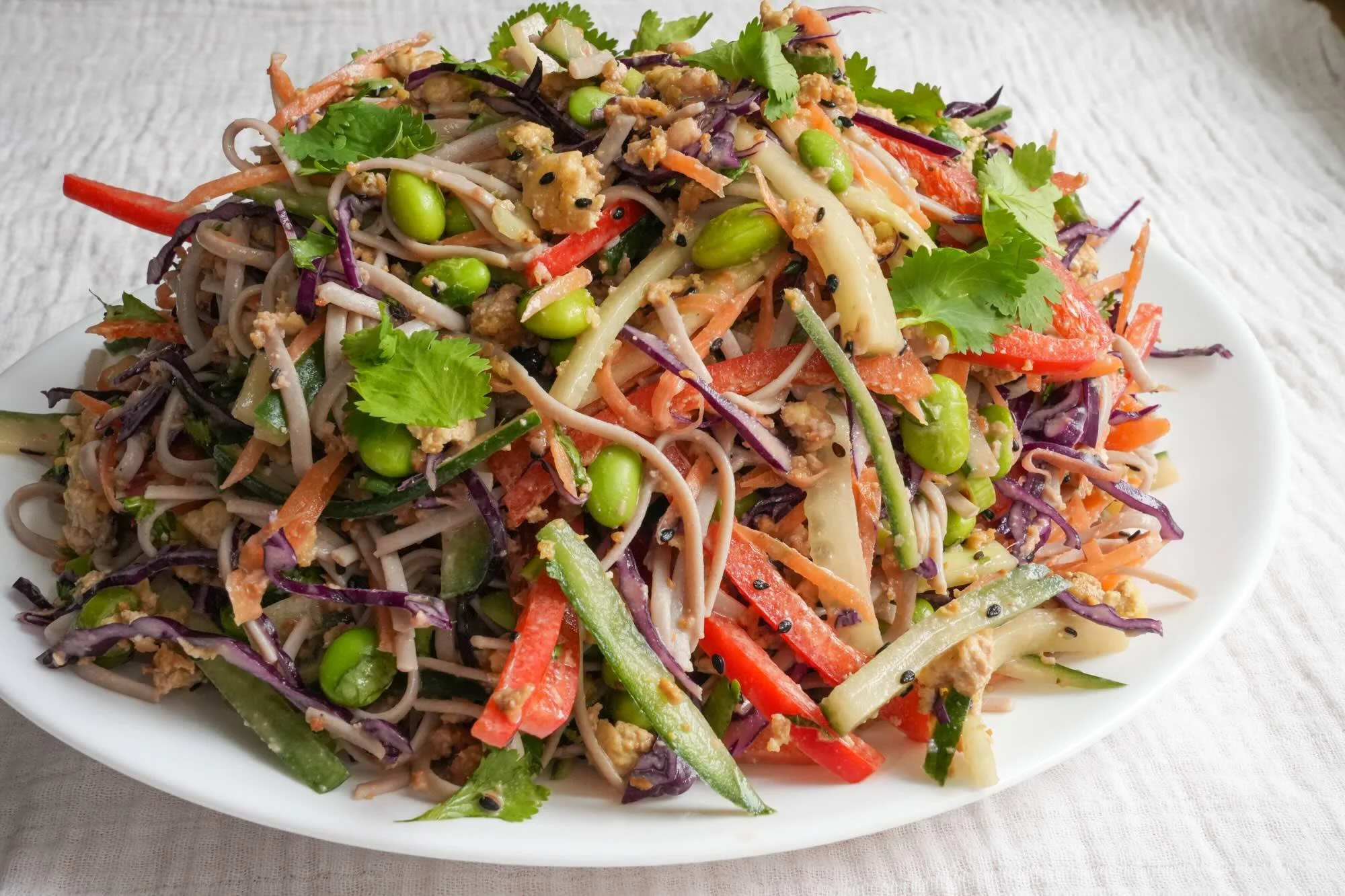 Assemble the salad. In a large bowl, combine the tofu, chilled soba noodles, edamame, red pepper, cabbage, carrot, cucumber, green onions, sesame seeds, and cilantro. Add the dressing, toss well to coat, and serve.